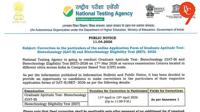 NTA GAT-B, BET 2026 Correction Window: The NTA has opened a correction window for candidates who submitted applications for the Graduate Aptitude Test–Biotechnology (GAT-B) and the Biotechnology Eligibility Test (BET) 2026. This one-time facility is being provided as a special measure to allow applicants to correct errors in their application forms.