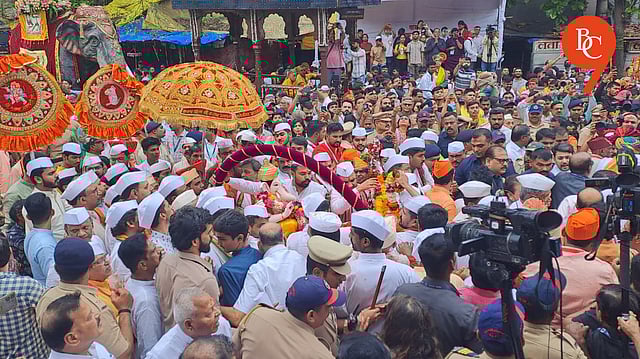 The first Kasba Peth Ganapati was carried on a traditional palanquin from Mandai to Lakshmi Road, amid drumbeats and chants.